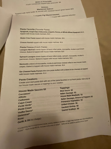 DO NOT GO HERE! HORRIBLE! The one star is for the bread and butter that came "with the meal"after we had to ask for it. I eat Italian everywhere I go because, well Im Italian. This was the most disgusting, over rated, over reviewed food ive ever eaten. Lets start at the beginning. Its in a log cabin that has no relative decor and from Wal-Mart. . no music of any type. There were so many tables crammed in to the rooms that you either bumped into them or had to ask them to slide in so you could get past. This translated into the loudest Italian dining experience Ive ever had. My wife and I could barely hear each other, it sounded like a college cafeteria. The waiter, Ian, does not understand that great service leads to great tips. We sat down at 715 and ordered by 725. nothing but our water came in the next 15 mins. The antipasto we ordered had melon on it, never seen that before, a pile of canned green olives,a pile of red olives, 4 artichoke quarters, and a small pile of pimentos...they all looked and tasted like they were bought from Wal-Mart. Ian refilled our water only twice in 1.5 hours. Our salads came 10 mins after our antipasto. As we waited for our mea I finished my canned beer and placed the glass and can to the side of the table. It was never taken away even though Ian walked by several times. 3 different couples came, sat, were served and left before Ian finally came back and asked "do you want your food now?" I was dumbstruck. He said ok let me go "fire your plates up real quick." Im assuming that meant microwave versus when he brought it to us 2 mins later, the top was steaming and the mushy noodles were near cold. How long they had sat there is beyond me. My seafood fra diavola had the following on it: 3 clams, 3 muscles, 3 shrimp, and 2 scallops.... Ive had this plate many times under different names and they all came with at least double of each sea food. The pasta was so over cooked it was almost breaking apart. My wifes pesto Alfredo was so bland, cold, and mushy she didnt even ask for a to go box, leaving half of it behind. Her dish came with chicken but the amount of chicken on her plate was ridiculous. It was maybe the size of a tenderloin. Also, they told the table next to us that they would not be able to give them any wine for a while because all their glasses were dirty. Overall this was literally the worst "Italian" restaurant Ive ever eaten at. A total WAIST of $60.