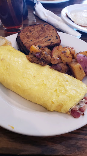 Overall: Decent assembly line type food, subpar service with usually long waits for brunch Pros: Food is just OK but reasonably priced Cons: 1. Service.. service.. service. They rush you throughout the process once you have been seated. Do not check on you except to take your plates. They watch to see when you take your last bite and then will take your plate right away. I wanted to tell them.. I get that you are trying to get other people in but guess what.. I waited too!?!? Ultimately it felt like "speed eating." 2. They do not offer omelets. They are more like egg wraps. Veggies are sautéed separate from the eggs (like 1.5 versus the 3 they advertise) and then the egg is layed on the plate with veggies layed inside. Nothing actually connects the egg and veggies. I did hear through another review that you can ask for any omelet to be made Into a scramble which would be more appealing than the omelet they offer. French Toast was ok but tasted a little like it had been microwaved. Basically my summary is that the food was like assembly line food versus a restaurant with a cook.