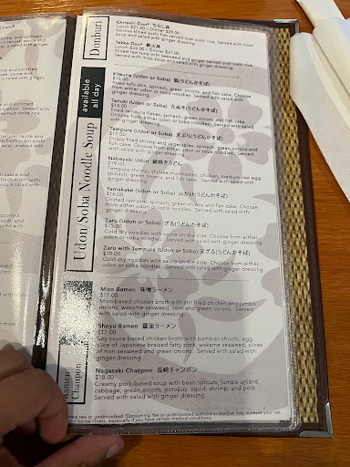 A bit disappointed in the udon bowl. The fishall ingredient was lipservice. Take a meatball size ball, cut in half, then slice the half, maybe 7 times (very thin). I received one of those slices & was told by the server that was normal. Nice location, atmosphere, food quality and service despite the lack of value.