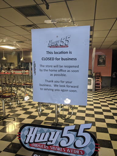 Hwy 55 makes excellent burgers but I am not impressed with store cleanliness. The floors always look like they are dirty. I particularly enjoy their shrimp burgers. The menu is fairly limited but they deliver the food pretty fast and it is cheap. They have frozen custard but I never buy it because I feel it is way over priced..