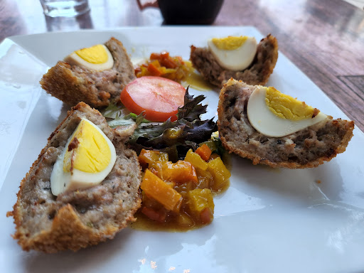 The atmosphere was a plus, Ill give it that. My fiance ordered the fish and chips and I had the English banger sandwhich. We shared half of each entree. First, the menu states that their food is all made in house. This for sure wasnt the case with the fish and the " chips ". The fries were obviously frozen and fried to serve. The fish had absolutely no taste, and the batter kept falling off every time we cut into it. For $13 the fish and chips were an entree I would float away from. The waitress was a sweetheart, and was quick to serve with a smile. My entree, the english banger sandwhich, was good. Again, the sausage didnt have much flavor, aside from the spicy style mustard served on the side with the sandwhich. The atmosphere was nice, but the food was what we were interested in and it wasnt impressive.