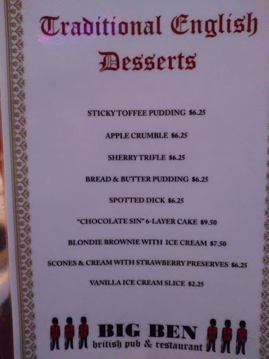 We have always had excellent food at Big Bens. Its our favorite place for fish & chips, and the beer is ice cold. They have Red Oak on tap - yea! Service has always been good too. Even when they are super busy we have never had a problem getting a beer refilled. Theres a great selection of British dishes on the menu, and their meat pies are superb! Nice British Pub atmosphere and sometimes live music. We love Big Bens!