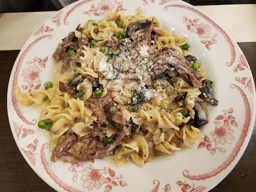 As a fan of stroganoff dishes, I ordered the brisket stroganoff on my visit on Tuesday, 1/24/17. The dish came out with beautiful presentation, but unlike the customary stroganoff dish, this recipe contains a cheese of some sort. Being cheese-averse (not liking the smell or taste of cheese rather than being lactose intolerant), I ate no more than two bites as I couldnt tolerate the taste and I had the dish boxed up for my son at home who has no similar cheese aversion. I fault neither the wait staff nor the kitchen for this, but I certainly do fault those who prepared this restaurants menu. The menu contains a description of the ingredients used in their dishes, and no cheese is identified in the description of the brisket stroganoff. Had I known, I would have made another selection. In the interest of their customers with lactose intolerance or an aversion to the smell/taste of cheese, cheese in menu items ought be clearly identified.