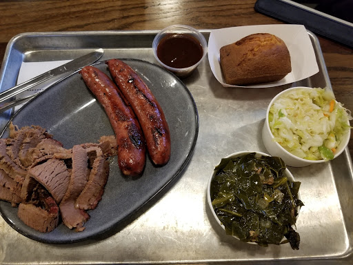 Good food great atmosphere. Theyve got the hip rustic atmosphere down and knock the food through the middle of classic and edgy BBQ. Most people will walk away pleased. The meat is well prepared, good selection, and pulled right in front of you. I could have asked for more smoky bits, but you run the risk of making it too dry. This was moist. Collards were the best thing I had there, made in a rich beef brisket jus. Green beans - meh. Okra has a fragile, non-greasy, corn meal batter. Vinegar slaw is not red slaw (which Im obsessed with) but had a fresher feel with what I would guess is rice wine vinegar - still enjoyable.