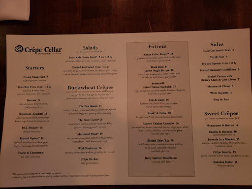 Crepe Cellar was really nice and enjoyable. The setting was really chill and romantic. My wife and I went around lunch time and it was too crowded. The Brie Pesto Fries were really good. I had the Black Bean & Carrot burger and it was really good. The cucumbers on top gave it a nice subtly crunch that was enjoyable. The crepe which we came for were good as well. Our server, Catherine, was really nice and friendly. I would be happy to go back.