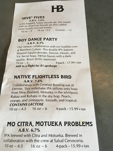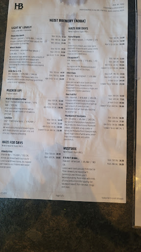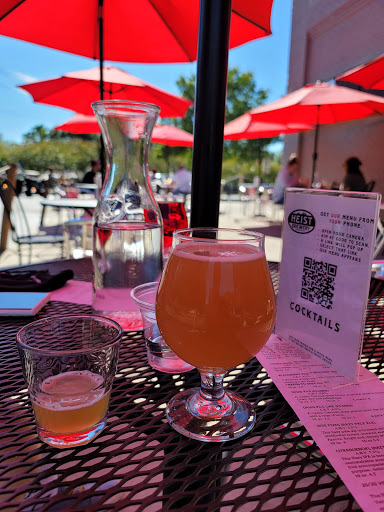 The beer was ok, along the lines you would expect from a small brewery. Now for the food. The menu has what they call "shared plates" that are about the same cost of the shared plates on the Capital Grill shared plate menu but less than half the portion. We had a party of four, orderd the tacos that came to the table with 3 how do you share 3 small tacos with 4 people? Orderd the burgers again came to the table with three for 12$ for 3 mini burgers I understand food cost but wow. We also had the wood fired strip steak for 15$ again very small portion and half of the steak was all fat and grisle that you could not cut or eat. Waiter asked how it was and we showed him and he said that "what do you expect from a ribeye steak?" My wife said that the menu said it was a New York strip and he replied with "all steaks are like that." In all we had 6 "so called shared plates" 6 drinks and bill was 180.00$ for 4 people, and left hungry. They should change the name from Heist to grand larceny brewery, because that is about what it is.