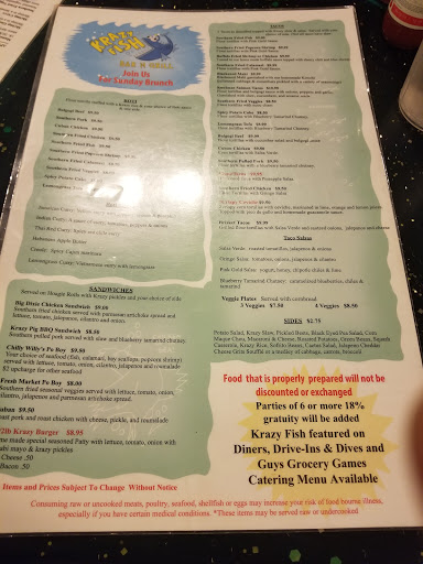 The service was good. Our server was always checking up on us and was very friendly. The food, however, was not at all what I expected. Between the reviews and a recommendation from a coworker, I was expecting eclectic but tasteful dishes. Unfortunately, the food was very subpar. I had the Krazy Grill with chicken and pork with a black eyed pea salad and jalapeno cheese grits. The chicken and pork were decent, but both tasted almost exactly the same. The black eyed pea salad was sweet, so I didnt really eat more than a bite of that. The jalapeno grits (which I was really excited about) didnt have much flavor at all. And my cornbread was dry and unappetizing. My husband had the Seafood Creole. For an $18 plate, I expected so much more. It tasted like the seafood had been defrosted and refrozen, there was very little salt, and none of the creole flavors you would expect. It honestly tasted like a watery mess. The green beans he had on the side were over-cooked and under-seasoned. My daughters fried shrimp were soggy, but her macaroni and cheese was decent. I had really great expectations, and Krazy Fish sadly fell very short of those.