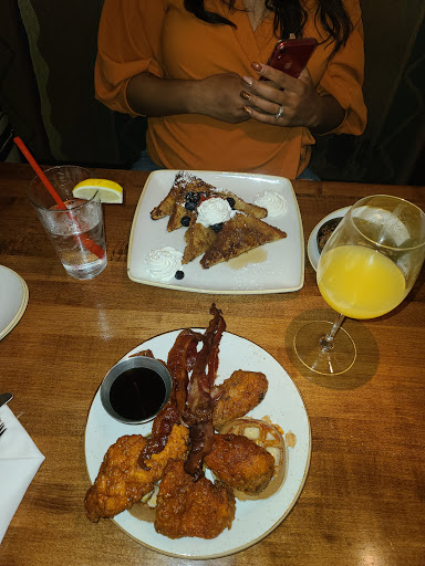 We were in town for a reunion and decided to stop here for lunch. They were offering their Saturday Brunch menu, which Im assuming offers limited options. The decor was very nice, dark and intimate, and the indoor patio was bright. We were sat by the bar, at a table near the bathroom. I actually liked the location of the table. It was out of the way from the main dining areas and offered a very quiet experience. Service was attentive but not overbearing. My husband ordered the burger (on a brioche bun) and regular fries. It came with a side of slaw, but he didnt eat it. My entree was described as Marinated NY Strip with a mushroom sauce and truffle fries. I expected a small strip steak (whole) but instead literally got a few strips of steak over about 5 small asparagus spears. I was a bit put off by the portion size to be honest. With that said, I found the food quite good. The truffle fries were hot, salty and savory. They stayed hot throughout the meal, which I was very happy with. The mushroom sauce, was tasty, though it got a bit gelatinous as it cooled. We also had peach bellinis and they were served in a large wine glass but you did not get a large amount. Again they were good, but we were both put off by the small portion.