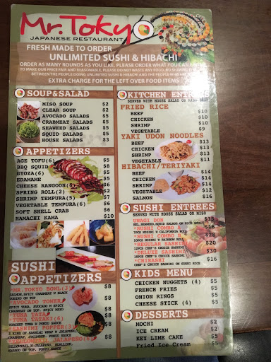 Me and my friend went out for a late lunch today before he had to go to work. We decided to choose Mr. Tokyo! I had never been before but heard great things about it so I decided we had to give it a try. Our Waitresses name was Leslie. She gave us a great service with a wonderful smile. Never was my drink or my guests glass fell empty. Its small with a Modern twist in the this Pineville. When we placed our food order the appetisers came out blazingly fast and delicious too. When it came time for the entrée the sushi rolls I chose were absolutely stunning. Me and my friend ate quite happily for a while. . . That is until I made the sinful Mistake of ordering a roll to many. I am a big fan of no waste left behind. But when I asked my server what the surcharge for extra is she said theres no true system here they just look and guesstimate. Which she got what looked like a senior employee or family of the restaurateurs she came and said for 10 pieces left it would be $10 but if I ate 3 pieces more it would only be $3. For that made no sense I enquired about how she came with such a price? Which would have almost been as much as double the cost of my entire meal. She said "Its just based on principle" So me being me I begrudgingly ate 3 more and left a little more fuller then intended. But besides that little quarrel over all the restaurant was a great bite and a great place for a amazing price. I would definitely recommend this to the sushi lover! But beware dont order what you cant finish or you might be in for a surprise surcharge or two.