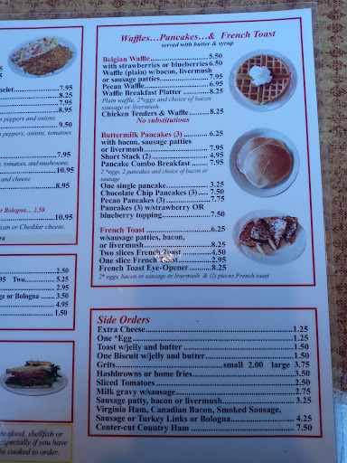 I go to this restaurant at least twice a week either for breakfast or lunch or dinner. Wonderful family atmosphere. Pancakes are very good, but the real deal is the 2 eggs, meat, grits or hashbrowns and biscuits or toast for under $4. The burgers are good as well as the other sandwiches. The baked chicken with potatoes is out of this world. Highly recommended.
