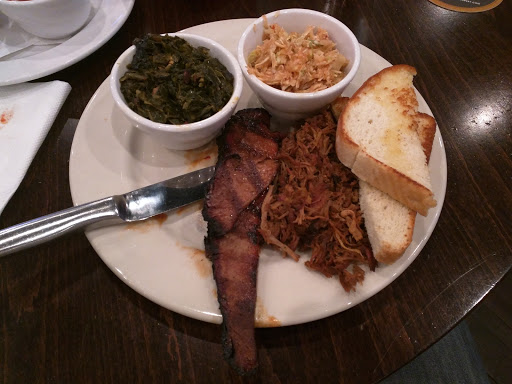 Its a nice spot. Free parking before 5 in the parking deck right past their entrance. Didnt know that until after we parked down the road. Now the food... Im super critical about hush puppies do allow me to say they have some of the best around! Pass on the Mac n cheese (lacking in the cheese department). Me and the wife Ordered the 2 meats course. We combination of 3. The pork had good taste but texture was somewhat dry. Not only in your mouth but it looked somewhat stale. Nothing the sauce could liven up tho. Which brings me to the second part, the sauce. Three main sauces, Lexington, Eastern, and their signature. Each were vinegar base and honestly after a few bites, they started tasting similarly. They had a rib sauce which was basically the same but with a tangy and thicker base. Not bad but nothing to speak on. The brisket was disappointing but honestly it was more because of how I like my brisket opposed to how they cooked it. Delicious smoky flavor, nice crispy charred touches, and a tolerable bite texture. BUT, it seemed like they precut the slices and recooked it. Also they added a sweet sauce to their brisket. Big no no for me. Ribs - St louis style thicker ribs. Nicely basted. Easy pull away bite but not fall off the bone with a nice chew texture. BUT, meat was somewhat dry and not as tender and juicy. Food was great and portions were generous but it left me wanting. Customer service was great by the way. Cool staff!!