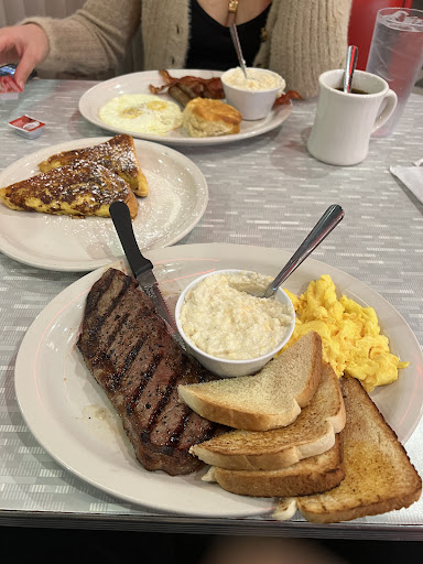 Friendly gentleman server with a neat accent - wish I could remember his name. Clean and has a vintage vibe (duh... Diner). Issues : music gets switched to hip hop/rap at night and it ruins the diner throwback for me. Also, limited milkshake options and all were subpar. If you are going with a short list, you should really nail each one. Chicken and waffles were the worst - bony wing portions that tasted of old fryer oil. Gross.