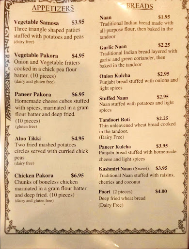 Top notch lunch buffet. Fresh nan brought to the table. Tikka Masala chicken was spicier than typically served but much appreciated and very tasty. Tandoori chicken was tasty and plentiful. Veggie dishes were also well done. They also have papadum which is unusual as well as a pleasant vegetable soup. Id rank this is one of the best Indian buffets youll find in the area. And I totally buy the "family run" image people say. The folks are pleasant and attentive and friendly. Many times Indian restaurants feel excessively formal and stuffy. Not here. For this part of the world $10 for a lunch buffet is priced about right.
