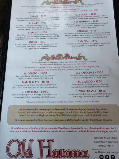Quality 3/5. If I need a light snack I may stop by again. But the price simply doesnt justify it. Parking is about 5 cars tops. Youll have to drive a bit away. Service 3/5. FORCING your customers to TIP before you even get your meal presents a pressured environment. The waitress explained to us "We ask you to pay up front so that you can enjoy your meal." I dont know the kind of service Im going to get. I dont want substandard service however just because the staff thinks Im already skipping out on paying a tip - when I simply want to wait and see if a tip is even deserved. I can enjoy the meal just fine without paying first. It seems like more of a disguise to avert eat-n-go nonpayers than anything else. Cleanliness 4/5. The tables had this oddly, sticky grease coating and if youre expecting to sit down and enjoy your meal you get the feeling youre supposed to clean your own tables as well. Which leads me back to why Im even tipping to begin with. Price 4/5. For the prices youre paying for the sandwiches youd like to think that at minimum - youd get a bag of chips or one side with your order. The sandwiches are okay but like others have said... THEY ARE SMALL. I barely had any pork on my sandwich. For claiming to be "The Best Cuban Restaurant in the Triangle" I was very disappointed because there wasnt any real flavor and the wepa sauce was weak and watered down. The food was mediocre at best. Its too much of a hassle with parking, forced pay and tipping up front and expensive bland sandwiches with no sides to ever warrant a revisit. We wont be back.