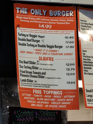 Got the sliders today, beef and turkey, with fries. Only Burgers makes great food. A big selection to customize your burger. Too many choices of drinks to list. Seat inside or outside. Plenty of seating. Service is fast. A baseball throw from the Durham Bulls stadium.
