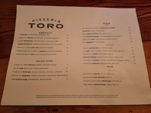 Im writing this review as Pizzeria Toro is closed for the second time in a year due to a fire. (Whats going on there?) But when they are open and if youre looking for a gourmet pizza, you cant do any better that Pizzeria Toro. Weve tried many of their pies and my favorite is the soft egg white pizza. It may be the best pizza I have ever had. Another favorite is the lamb meatballs pizza. Prior to enjoying your pie, make sure to try the Tuscan Kale salad and for desert the olive oil cake is very good. During this time that they are closed for repairs, they are hosting a "Toro Dreams" series of events at The Cookery. Every few weeks they setup shop in The Cookery for a themed night (Oysters, Mexican, and spaghetti are recent events) with all proceeds going to a local charity. Its a great way for the owners and staff of Pizzeria Toro to keep cooking while helping the community at the same time.