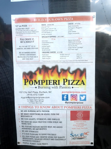 Definitely molded in BCBBs image, the short of Pompieri is this - great food, good service, meh atmosphere, and slightly-higher-than-average prices for Durham. In terms of atmosphere, I visited only a few days after it opened, and it was of course mobbed. But I dont think fewer people will solve the problem of noise. First, I expect it to be busy most times, but beyond that, similar to BCBB, it has a large open floor-plan with high ceilings, which, while it looks cool, just lets sound collect and bounce around such that its hard to hear much. I usually choose the patio option at BCBB for that reason, and hope Pompieri will come up with something similar. The decor is interesting, but seems to lack a bit of cohesion right now. I think perhaps there will be more coming down the pike the longer theyre open. Service was very prompt, although it seemed they had hired way more staff than they needed to, until they could see exactly what volume and speed would settle on. There were so many staff standing about waiting for something to do that they whisked plates away as soon as they perceived you to be done, which was disappointing to me. I was holding a large piece of crust I intended to dip in the truffle oil still remaining on my tray, but it was taken away before I could because the lack of pizza on the tray incorrectly signaled staff that I was finished. Plus having your table bussed so quickly just makes me feel like the restaurant is rushing me out, which I never appreciate. This brings me to the food. It was, of course, great. I know Seths restaurants source lots of local and fresh ingredients and put them to best use, so I was pleased and satisfied with the quality. I have just one minor complaint, which is that since they dont allow substitutions, it would be nice if they had a few more vegetarian or at least non-pork items on the menu. I know we live in the South and many people love pork, but there is still a strong contingent of vegetarian and kosher eaters, and there arent a lot of menu options for us at Pompieri. One other thing to mention - while the scissors they hand out to cut the pizza are a cute conceit, I didnt come out to dinner to do work. I think Id prefer if they just cut the pizzas for us. So my recommendation would be to visit during off hours (not at peak lunchtime and dinner hours) to avoid crowds, noise and rushing, and you wont be disappointed in the food. A nice addition to the downtown scene.