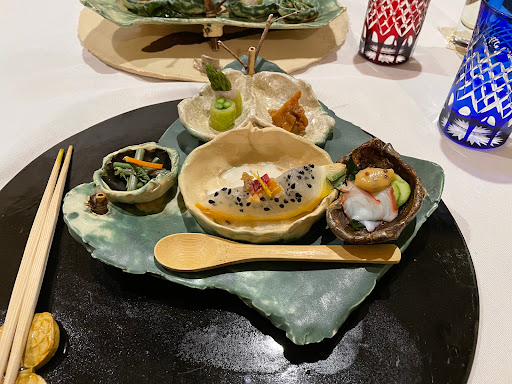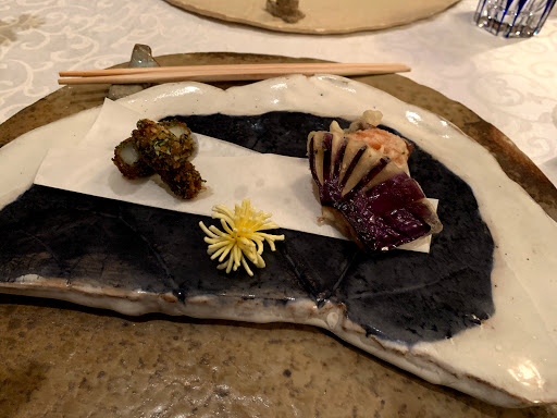 4.5 of 5 stars (excellent, fine dining). Allow 2.5 to 3 hours. Cost: $85 per person, not including alcohol or gratuity. One of the most extraordinary meals you will ever have. Small, 26-seat dining room. Eight beautifully crafted, small courses presented on hand-made pottery. One amazing chef (who is also the potter). Kaiseki-style dining consists of a sequence of dishes, each often small and artistically arranged. Here is the order of the dishes we had: amuse bouche appetizer sashimi fried grilled broiled rice dessert We took our own bottle of bubbly ($20 corkage fee), but they have a small, reasonably priced wine list (less than 100% mark-up from retail). I, also, enjoyed a flight of four premium sakes for $28. This is not a place for those in a hurry or those looking for leftovers to take home afterwards. They cannot seat you together if you are a group of five or more. Currently serving a vegetarian menu on Wednesdays. Half star deducted for bathroom: could use some improvements.