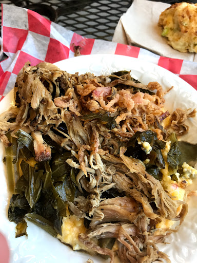 I had been wanting to try this place for a long time and I finally made it. I was disappointed in their selection of sauces to not have a "hot" flavor. They had mustard base, chipotle, vinegar, and sweet, but nothing with a little kick. The BBQ was very tasty as was their cornbread and cheese biscuit. I loved their pimento cheese grits also, never had anything like it previously. Very pretty place to eat outside but inside seating is limited.