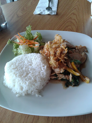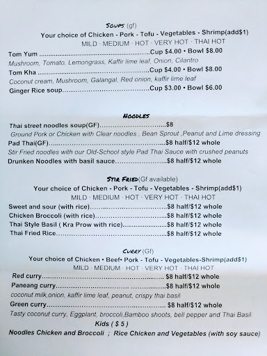 This was a very bad experience--altogether. I got 3 items of food and they all had issues. Ill say upfront that Ive been to many Thai food places and know my way around Thai food. The mushroom soup tasted like something was very foul and tasted, literally, like how a garbage dumpster smells. I sent it back only to get really no response, or offer to do something to make things right...nothing. One of the staff kept going over to a table where a couple were eating and this staff kept taking food from the customers plates, with her hands, and eating and then handling other costumers plates, etc. Thats just really bad ! Im sure this staff knew the customers at that table but eating with ones hands, while working, and while handling other customers food and plates?! Thats just really bad. The 2nd item was fresh rolls, which were sloppy-made and the rice-wraps were not fresh but very rubbery--to the point that I couldnt really eat them--and didnt. The 3rd item was a chicken stir-fry. The chicken was very overcooked and the sauce was just a salty sauce with no flavor really. I watched a couple come in and they had to literally sweep off the food from whoever was seated there before b/c the table wasnt cleaned, (and there was plenty of time and it wasnt too busy there). Ill never make the mistake of going there again. Gross, sloppy, overcooked, and staff was actually eating off costumers plates, numerous times, while working and causing cross-contamination with her hands. All around a bad experience. NEVER again.