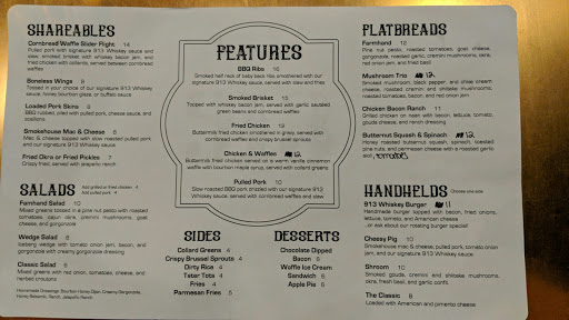 I selected 913 as it had good ratings and was close to an appointment I had later in the evening. Definitely a huge disappointment and if you glance through the reviews, you would have to think they are paid for once you experience the service and food of this establishment. The poor experience started outside. Parking seems nonexistent and if it does exist, it is a mystery to the customer from outside. Once inside, there was no host for about 15 minutes and the bartenders would look over with no concern that guest were not being greeted. Finally approached the bar and ordered my entree and cherry smoked old fashioned. The barbecue pork tasted as if it came from a microwave, was dry, and the $8.00 a bottle sauce left a lot to be desired. Parmesan fries were disappointing as well unless you like fries with a few shreds of dry Parmesan on them. Old fashioned had potential but was not stirred, which made the first sip horrendous. Ice ball was a nice touch, but about the only thing good in this restaurant. The guy that came in next to me ordered a salad and they forgot to put the cheese on his salad. Most waitresses were coming to the bar asking questions on how to serve their patrons and the second bartender seemed to be in training. Certainly does not seem like a well managed or organized facility and if the service I received is their standard will most likely have the building up for rent within the year. Final touch was the bill, was in a hurry by the time I received and paid with $100.00 cash. Change was brought in all fives for a $20.00 total bill. Maybe they dont have twenties as this does not seem like a higher end restaurant.
