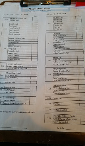 A true diamond in the rough for great Sushi. Akashi is a small place on High Point rd. in Greensboro near the Coliseum. It is a small and unassuming building, but do not let that stop you. While the building and decor may be a bit dated, the food and service inside is the best you will find. I recently tried Akashi for sushi at lunch. I sat at the bar where the owner and sushi chef, Suji (Soo-jee), recommended the lunch sushi special. I ordered it, and he asked me if there was anything I liked in particular, or did not like. I told him I enjoy a variety, and there is nothing I wont eat. While he prepared my sushi, the meal came with a standard appetizer salad of mixed greens and ginger dressing. When the sushi was ready, I was blown away at the portion! 12 pieces of Makizushi (rolled sushi) and 6 pieces of Nigirizushi (fresh seafood cuts over rice) for just $9.50. That is an incredible value in this area. The wasabi he served with it was clearly fresh. There was no dried out quality to it, and it was very pungent. The Nigiri included fresh tuna, salmon, octopus, shrimp, crab, and eel. While dining, I got to know Suji, as the restaurant was not very busy while the area colleges are out for the summer. I come to learn he has been a sushi chef for nearly 30 years. He was interested in what I do, and we had a good conversation while I ate. He clearly knows what it takes to keep someone coming back on their lunch break. I will certainly be back. Other than sushi, they serve standard hibachi fare for lunch, as well as more authentic Japanese cuisine, for prices that are lower than other similar places in the area. I highly endorse Akashi for anyone looking to fill up on expertly crafted sushi for a reasonable price.