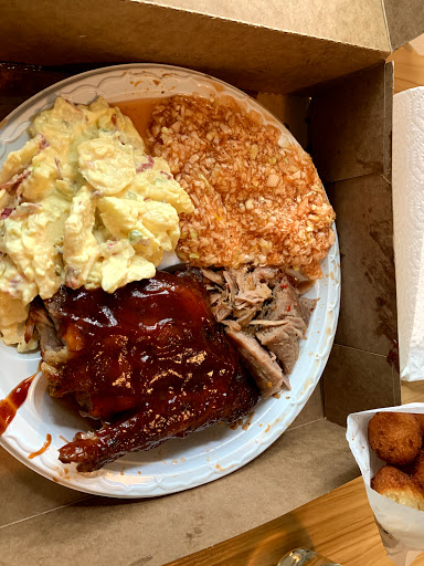 Well, barbecue is what I love and I should have known something was up because I didnt see any smoke coming out of the smoker. The food was just okay. The barbecue sauce well the extra I asked for was either not barbecue sauce or just too spicy. The chicken was not seasoned but the skin was good. The ribs were good but didnt taste like they were grilled. The peach cobbler? I didnt even finish it. I probably wont eat here again until they lower those prices. They charge too much for what they are selling.