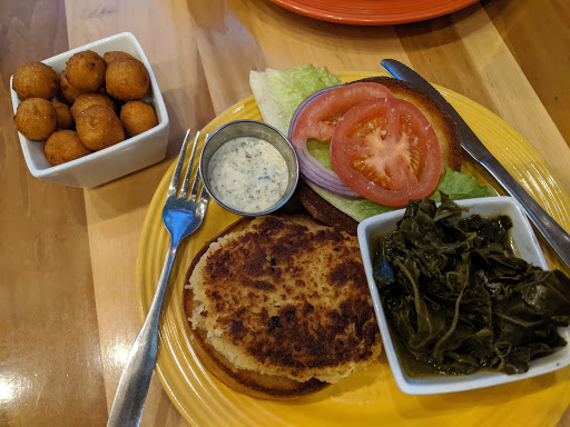 I keep getting told by friends to check this place out. I finally gave in and went. My wife and I went on a Wednesday night. We were only the 2nd table in the restaurant seated. When I looked through the menu one thing stood out. They really need to get some organization to the menu. They are trying to do too much. Some entrees come with 2 sides, some with 3 but you dont find that out until you order. We ordered an appetizer and then our entrees. The crab dip was good, a nice start to the meal. We both had salads and it took a long time for them to come out. When they did come out they were room temperature. Salads should be cold, especially since they used chilled bowls to serve them. The dressings were homemade and were really good. Definitely the best part of the salad. Then another waiting game to get the entrees. Another downside of their menu was no descriptions on the preparation. I ordered shrimp and grits and was unaware that it was served with mushrooms. I usually try never to send anything back but unfortunately this one had to be redone. Once corrected it was good. My wife had the blackened salmon and it was good. Warning, if you like your salmon medium you will have to specify. It came out well done but was not dry. Overall it was ok. The service was SLOW. Really slow. Annoying slow. The food was good, not great. I will probably go back but I will not be in a hurry to do so. On a side note, rolls/hush puppies are a side. It seem cheap to use bread as a side. It should be included. If you are going to charge $20-$30 an entree dont nickel and dime me for bread.