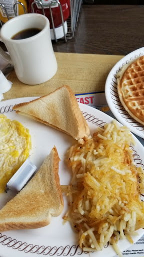 The food is on point. Our waitress was very sweet and cute as a button. Seating was a little tricky, theres no sign telling you to seat yourself, so if youve never been to one of these waffle houses you wouldnt know to do so. The bathrooms are ok. And check out (not for me), seemed a bit slow for the majority of customers.