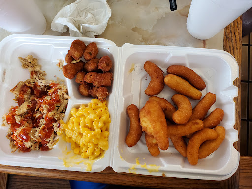Good southern style BBQ, wings, slaw, corn sticks,green beans, etc, and plenty of iced tea. Nothing foo foo about it. Quick and hot. Diner style. Order at counter indiv items, meals or in bulk.