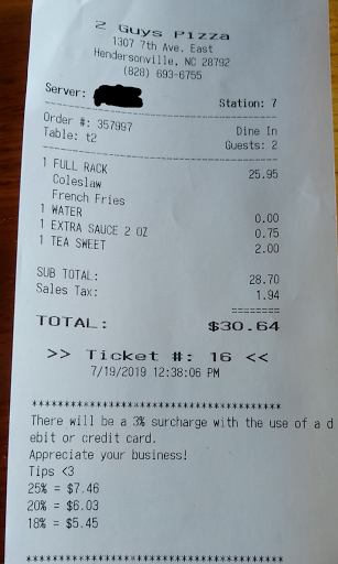 2 guys pizza is the best place in town. I love it there, every time i go their. The place has a really great atmosphere. Number one? the pizzas are off the charts their extraordinary.They are the best in town. They are so delicious and now i cant even eat another pizza from any other restaurant anywhere!!!!. The burgers are mouth watering and i went there yesterday with my lovely lady and she had a mushroom Swiss burger and she said i quote. "the best burger iv ever had!!!" The wings are amazing also. they also have the best paninis, lasagnas, spaghetti then anywhere else.everyone that keeps talking bad about the service, they are amazing people. The staff is the best part in my opinion, and the management takes really good care of there staff and employees. There trying to get your food, when and how you want it. There AMAZING! there always 100% nice to. You cant walk in there and say that the atmosphere sucks because the atmosphere is great. Everyone loves the paintings and quotes on the walls also. You can walk in there and walk out with the best smile on your face. Why? because 2 guys pizza and ribs is the best restaurant in this city of Hendersonville.