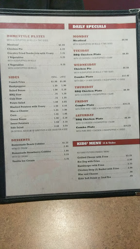 Country BBQ a has decent barbecue for the price. Good pulled pork sandwiches and plates, amazing green beans, hush puppies, slaw and more. Their chicken is great too. The main reason this place stands out is their biscuits for breakfast, the tenderloin biscuit may be the best breakfast biscuit Ive ever eaten. MUST TRY STRAWBERRY COBBLER!