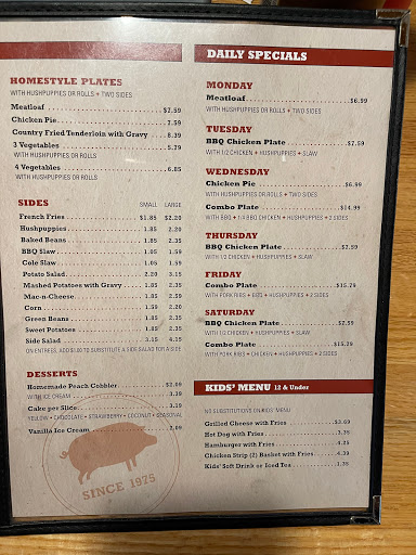 Overpriced! I ordered two chicken tenders kids meals which totaled to $7.98 which didnt even include drinks... then we ordered two large chopped BBQ trays and the food wasnt even in a tray. It was falling out of a holder in the bag and it totaled to $17.50 for both trays no drink included. It was so small I even went back inside to make sure it was a large tray. I was disappointed in the amount of food received and the price. You can get a better deal and more food at Carter Brothers or Stameys.