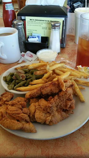 This is a great family place. Always see folks we know. Their pintos beans are the bomb. Not out of a can. I could eat just a big bowl of them. Their flounder and shrimp was excellent. I love that their shrimp are not the tiny ones. Full of flavor and fried to perfection, ditto for the flounder. Their side salad was really cold, crisp and delicious and their dressings are made fresh everyday. Bridget and Wendy are wonderful servers and always so sweet and kind. Their pizza is great as are the wings. I saw some one else get the ribs and they looked great. I have to give those a try next time. They have a vast menu so there is something for everyone. But save room for dessert. Red velvet cake, chocolate cheesecake, coconut