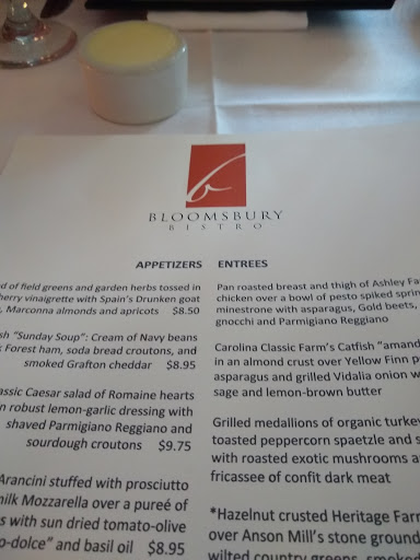 The Bloomsbury Bistro has consistently been a favorite for my husband and myself for 10+ years. When we first found the restaurant, we fell in love with the imaginative and excellent food, but even beyond that, for us, was the service. As a fairly young-looking couple, we had found that wait and host staff at many of the "nicer" restaurants in the area would treat us as second class citizens, presumably because of our apparent age (i.e. they thought we wouldnt tip well) and because we did not spend a fortune in alcohol. The Bistro, on the other hand, has provided us with excellent service every single time that we have eaten there, even when we were dressed a bit sub-standard. :-) The portion size is good and, many years ago when we had our celebratory graduation dinner there, every single member of my particularly picky family came away happy. And thats really saying something. The soups/bisques are out-of-this-world and the seafood is typically amazing. Several years ago, I had a few hit-or-miss desserts, but in the past five years I would say that the desserts have risen to the level of the appetizers and the entrees in quality and creativity. Its definitely worth a try, and in my opinion, definitely worth the cost. The only downside is that if you want to have a quiet dinner, and there are other people there out "for a good time," the restaurant can get a bit loud. I highly recommend that you give the Bloomsbury Bistro a try - weve been happy every time!