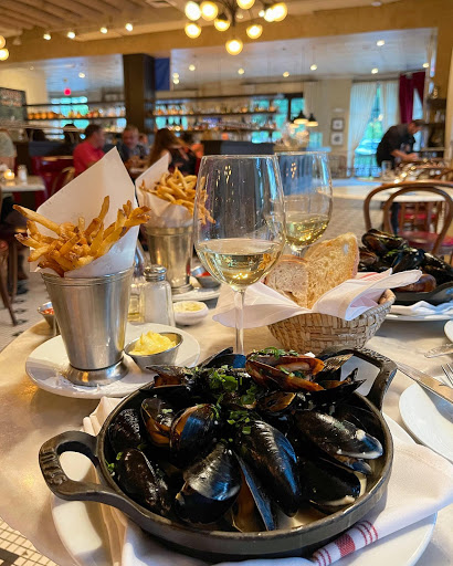 We had reservations for a Friday night during Restaurant Week, so the place was very busy, and we had to wait at the bar for a short while until our table was available. The seating hostess, bartender and all the wait staff we encountered were delightful, professional and upbeat. The atmosphere was lively, warm and welcoming. Despite being a fairly large space, there as an intimacy that was very charming. We didnt try the special Prix-Fixe menu but ordered some of the regular offerings. My husbands Shrimp Cocktail was lovely, with large shrimp cooked to perfect texture and firmness. The busy kitchen didnt provide him with the appropriate fish fork, but that was solved by giving him one of the two I was given with my Escargot. My escargot were swimming in a somewhat watery broth, seasoned with butter, garlic and herbs, but oddly, they tasted like they were boiled in water and had the sauce added afterwards. They were not infused with the rich flavor I normally would have expected. And there was no bread added to the dish for the buttery broth. Salads were then presented, and Frisse with lardons was well flavored, although the poached egg was infused with vinegar and overcooked, with a yolk that was completely set and solid. The two pointless large slabs of toasted bread would have been welcome with the escargot. On to the main courses; we chose classics. My Coq au Vin was very nice, tender chicken nicely flavored served atop creamy and rustic mashed potatoes. The flavoring was delicate but balanced. I would have preferred a little more wine flavor; the namesake of the dish was absent and the flavors just didnt quite marry. My husbands Bœuf Bourguignon was a bigger disappointment, as it was presented with a thin, watery broth instead of the rich, savory sauce the dish is known for. It looked and tasted like a bowl of soup with insufficient broth. Once again, flavors were good, but where was the body? Plus the meat, which was a lean cut...perhaps top round, was not browned prior to cooking and unpleasantly rubbery and firm. Perhaps someone thought that smothering the dish with pearl onions would make up for the lack of other vegetables? Maybe thats all that was left after a busy night? But every other bite was an onion... and after picking through the dish, there was quite the pile left over. The flavors all the way through seemed to be good, but rushed in the kitchen and lacked soul. Our impression was that the classic dishes we ordered tasted like French-inspired cafeteria food... good flavor, but lacking completion. I think we felt like we just at a French restaurant in a theme park, like Epcot. All the appearance and concept, but not enough soul. Maybe it was because they were so busy, but we were disappointed. There are better choices for French food in the triangle, such as Vin Rouge in Durham or Saint-Jaques, which is also in Raleigh. Perhaps I might return on a less busy night, but Im in no hurry given other choices.