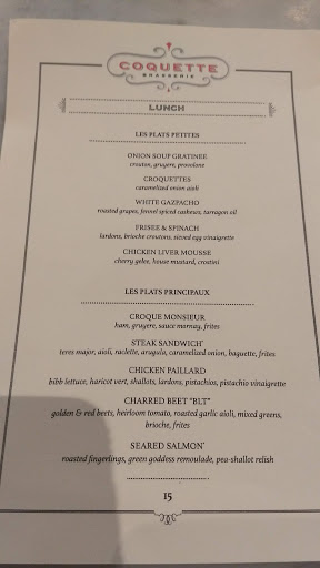 Ive eaten at Coquette Brasserie many times. Friday January 30 2015 at 2:00 pm was horrible. The restaurant was full, I later learned to be likely because it was Restaurant Week in Raleigh- possibly why our lunch was abysmal. Escargots were teeny tiny swimming in an ocean of butter. Charcuterie was sparse and uninspired, and we got the end cuts of the duck confit- unrecognizable. The crispy trout was 1 and 1/2 teeny tiny strips of trout. My sons salmon looked OK but as soon as the waiter placed the trout in front of me the table immediately smelled rancid. The accompaniment to trout is now lentils, which I love. But lentils should smell earthy sweet. These lentils smelled bad. I ate them anyway. Two hours later I felt horrible and had a headache. That night and the next day I was sick. Foul. Sick. Youre going to kill somebody, Coquette. All this food was brought out nearly simultaneously, for which Lori did apologize. Just horrible.