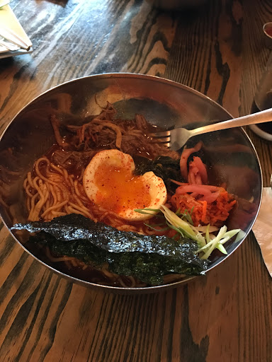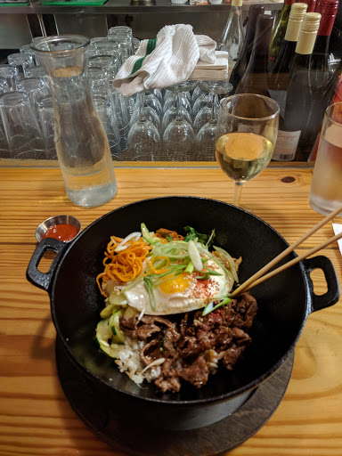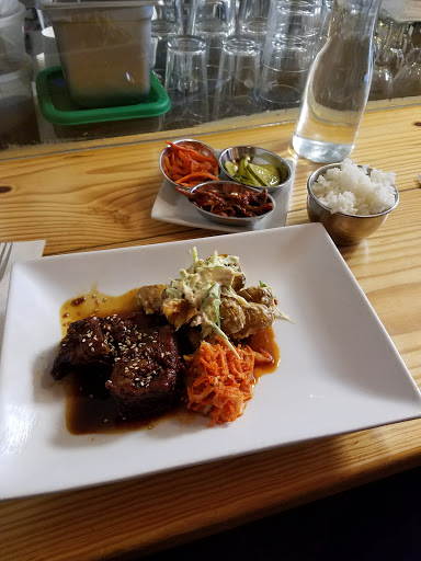 Good, "casual posh", dining. Only about 30 seats and they do not take reservations. Allow 45-55 minutes (no dessert). Cost: $30 per person, wine included, no dessert, excluding gratuity. Opened about a month now, but running smoothly. Not your mamas Korean with slight twists on most dishes (they call it "Korean inspired"). Side greens were way too salty (sitting in a puddle of soy sauce). Shrimp rolls are very large and very nice. No chicken dishes? No tofu dishes? Paper napkins.