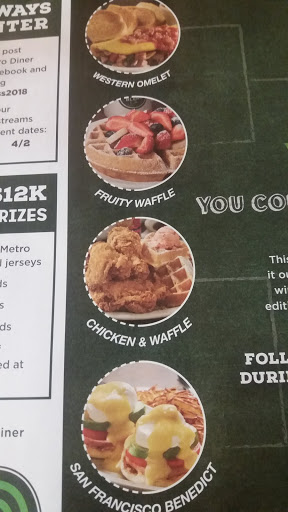 I would give Metro Diner 3.5 stars if that was an option. We had the crab cake eggs benedict, the veggie omelette, and the basic breakfast combo. The crab cake eggs benedict was the best of the three by far. The veggie omelette was boring. Ours had very little cheese and the seasoning on the veggies was hard to detect. The breakfast platter was average, the hashbrowns were the tastiest bit on that plate other than the bacon. The eggs, toast, and pancakes were well cooked, but not very flavorful. Someone else at the table ordered the huevos rancheros, and at least visually it looked the best of the entrees on the table. Prices were about $2 higher than other diners Ive eaten at, but portions were increased along with it, which feels fair. Service was good overall. A few moments we sat with empty glasses, but not long considering the busyness. The biggest negative criticism is the noise. Theres no sound barrier between the dishes and plating in the back and the seating. Further theres just very little to block the sound in the seating area. We were all yelling to hear one another. All the seats were taken, so maybe at a slow moment, if there is one, it would be okay. If I went back, I would likely focus on their bolder flavor dishes and order take out.