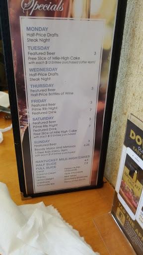 My family and I went on a Saturday evening. The place is clearly popular, as they were quite busy. We managed to find a parking spot, and headed inside. The wait for a table was awkward. There wasnt a lot of space to stand or sit, and I felt like I was constantly in the way. Standing and waiting outside wasnt really an option either, as they had no way of notifying anyone outdoors a table was ready for them. Once seated, we were taken care of fairly promptly. We received our drinks, and our order was taken. One member of our party ordered prime rib, medium rare. Unfortunately, a while after he put in his order, our server came back to say it wasnt possible. They only had medium well and well done cuts left. He decided to get the rib eye instead, like myself. When the food arrived it looked great. The fish and chips were a huge hit, and the roasted seasonal vegetables were fantastic. The rib eyes, unfortunately, presented an odd issue, though. Mine was perfect...tender, marbled, cooked just as Id requested (medium rare). The other person, however, could barely cut into his for all the gristle to be found in his cut. I ended up sharing my steak with him, upset with the discrepancy. The experience was pretty hit or miss for the most part. One thing that redeemed it was the Saturday special...a free piece of mile-high cake with every purchase of an entree over $13. There were a number of choices, and we each tried something different. Across the board, we all enjoyed the cake (which our server kindly packaged to go so we could take it home). Its likely well go back and give Nantucket Grill another chance. While some of the experience wasnt great, the things that did work out were spot on. It seems fair to try it out again in case it was just a bit of an off night.