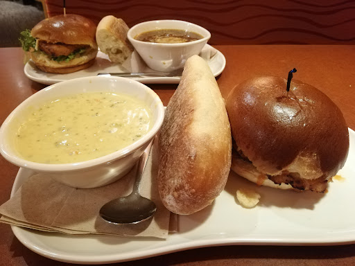 gross,many dirty tables and the employees not clean it up. They not volunteer to give us food, give food wrong and not the silverware that we need. The walk in front of female customers. And block the walk away and try step on the foot. Stand behind female customers. and yell in the ear. Walk away from female customers. And the female customers have to ask them to come back and finish the job several times, talk back rude,rush to get rid of, yell and interrupt, try to stick the sharp fingernails into the skin of the hand, repeat the same questions,. And run away and not come back at all. While wait on . Not volunteer to give the food. The food is always good at Panera bread. And a lot of good eats at moderate prices. The bakery is great. The parking lot is bad,tight.