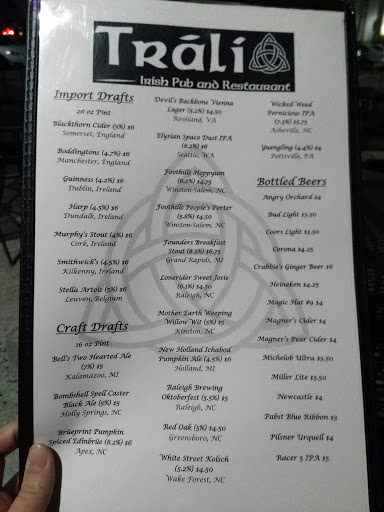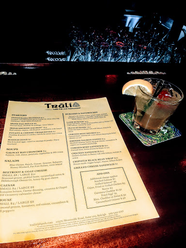 My girlfriend and I ate at Trali last Tuesday. I was a little skeptical at first but we warmed up to it pretty quickly. Its good to have a staple pub to rely on in Brier Creek. The ale house is ok, but too damn loud and smokey. The butternut squash soup we had as an appetizer was among the best Ive had anywhere ever... and thats saying a lot. There was something very subtle and nicely done about it. Shepards pie I had for dinner was overall quite good also. My girlfriend had a Jamaican chicken sandwich... fairly typical pub fair but good as well. The service was above average and the decor was thorough and not too cliche as one might expect in a new pub. The quality of the interior is fairly nice. A problem I had was that the a/c was blasting too much. It was too cold in there which is typical of most restaurants here. Also would recommend they offered nachos and beer specials, but thats mainly for my preference. Id definitely recommend this place to friends and plan to go again after work today for a few pints.