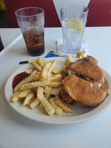 Just across the parking lot from my hotel (Candlewood Suites) so I decided to try it. Absolutely wonderful cheeseburger and fries. You could tell the leaf lettuce, onions and tomato were freshly cut. The hamburger was good quality meat and grilled with that crisp-edged technique that I love. The iced tea is brewed perfectly -- not pale and thin but with the correct strength and color and plenty of clear ice. Lemons were freshly cut. Also enjoyed the typical "diner feel" with the red and white cushioned seats at the bar and booths. Nice bunch of folks working there, very friendly and efficient, and great eating neighbors -- listened to four local church ladies discuss their choir plans and goings on. Will eat here again for breakfast tomorrow and every time I pass through when I travel.