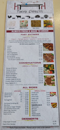 Tokyo Express has a good selection of sushi and hibachi fare. The atmosphere is quiet and clean. Great to get something to go or eat in.