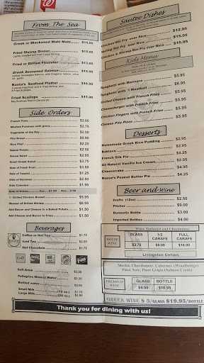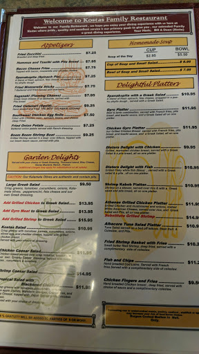 Good food as always with one exception. Our granddaughter ordered fruit plate side. $3.95 waiter said it was pineapple and oranges was actually cantaloupe and oranges. 2 all slices each. Really not up to Kosttas standards they should reconsider this offering.