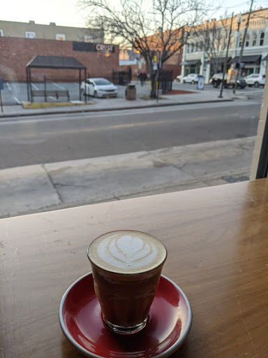 Cozy yet trendy coffee bar. Open, with a lot of light. Great location in downtown. Window seats to sit and work, a long table for groups and a bar. Simple coffee/espresso options served in mugs. They also offer beer on tap. Breakfast burritos from farmin on front. Grab and go beer. The dry goods part is some retail items like ladies shoes and trendy men backpacks.