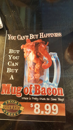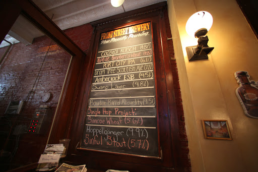 We only had one night to enjoy the downtown scene in Wilmington one Friday night. There were so many restaurants from which to choose, but were glad we found Front Street Brewery. The crowds waiting outside were our first hint that this was a popular place. A smiling doorman held open the door and greeted us. Nice touch. There was a long wait, of course, but the hostess took our number and texted us when a table was ready, so we had time to explore Front Street a little more. The food was good and reasonably priced. My Ruben was a traditional one -- just perfect -- and the loaded potato salad was wonderful. It was creamy with lots of mayo, just the way I like it. My husband had fish and chips, and though he wasnt thrilled with the breading, thought it was tasty. It was the beer of course that he enjoyed the most. Its always the waiter or waitress, though, that makes or breaks a dining experience, and luckily we had a great one. Jackie was friendly and pleasant from the start. She knew her stuff and was able to answer questions and make recommendations, especially when it came to the beer. Though she and the restaurant were incredibly busy, she took time with us and never made us feel rushed. Very efficient also! We ate on the upper level and were in awe when we started down the steps and saw the bar. Hundreds of bottles sparking in the light and reflecting in the mirror made quite an impression. We love to eat at brew pubs, and this is one we would definitely return to often, if we didnt live six hours away! At least we have a cute Front Street Brewery glass in our collection of micro brewery glasses to remind us of a very enjoyable evening.