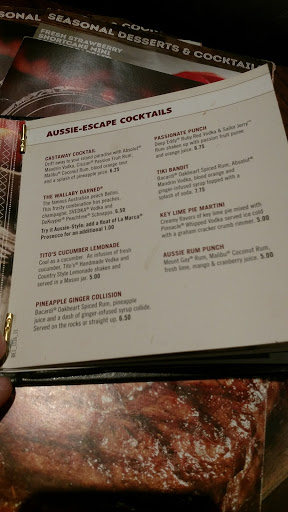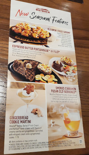 It was a pretty bad experience. Me and my fiance was sat in a corner next to their wash bucket which didnt smell great. It was lunch time so we expected smaller portions, but these were ridiculous. I got the chicken breast (delicious) but only got 10 fries!! My fiance had the steak and shrimp the shrimp was cold! Not everything on the menu was available :( Overall we was disappointed. We live in Raleigh and I love the outback there!!!! This one just wasnt up to par.... Service was good though!!!