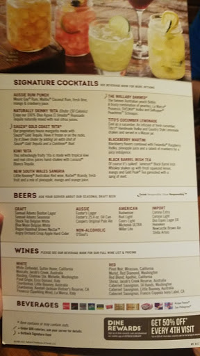 This was my first bad experience at Outback. Its been a few years since I have been to an Outback restaurant. The only reason I didnt give them 1 star was the service was good. My salad had a lot of bitter lettuce and very watered down dressing. They use to give it to you on the side. The iced tea was also very watery. It took them 3 tries to get my steak cooked correctly, We just finally gave up and left.