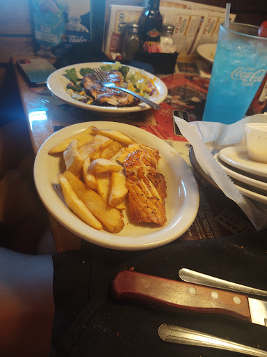 I mainly rated this for the good service we received especially for a split large party of 11 ppl including 3 kids 6 and under. Everyone seemed ok with their food I however wasnt pleased with the outcome of my grilled salmon. I asked for it to be cooked charred well beyond culinary standards and it wasnt. Even after sending it back it still was barely a standard grill. I like it dry and usually have to show a picture at any restaurant I go to serving it. Its the only protein source at a roadhouse that I eat. The rice pilaf was salty for me as a person who doesnt eat lots of salt and it had been cooked in chicken broth. So, not a good fit for vegetarian diners. The sweet tea was also mediocre as it had a weak taste and was pretty light in color. The rolls were smaller than usual like mini versions but still good. The sweet potato I exchanged for rice was great and thats without any season or sweetness added. Straight from the oven. Otherwise we had no problems and we ate late had at least a 30-45 minutes wait. Avg wait was 25 minutes in the 830p time frame. Not bad for a busy day and time. Would return if company as a group wanted to otherwise not on my own because Im limited to the salmon I didnt care for. I had bbq sauce added instead of lemon butter for better flavor.